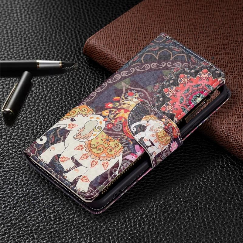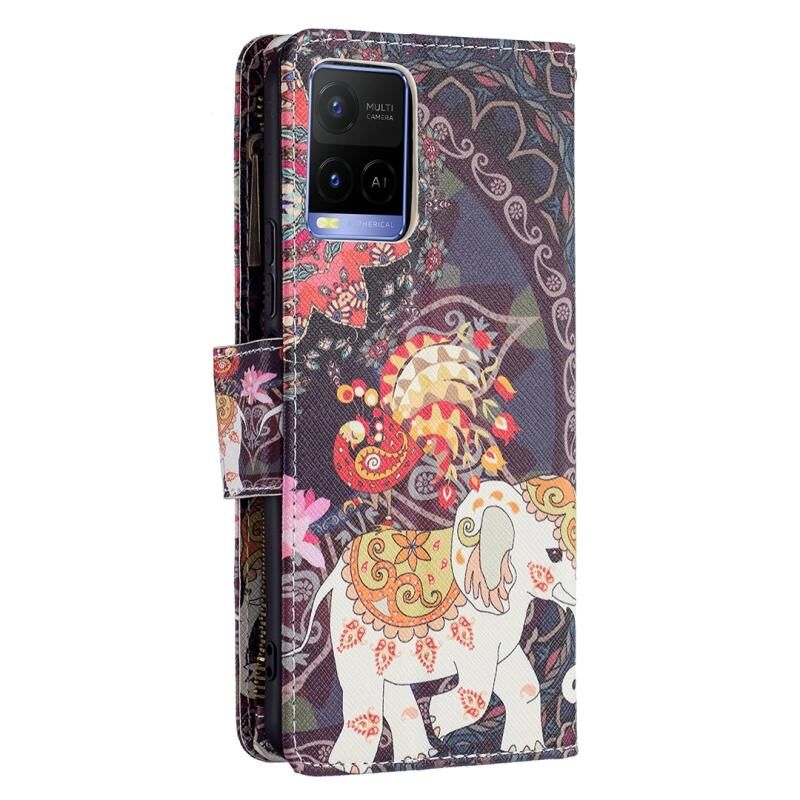 Θήκη τηλεφώνου δέρμα κατακόρυφου ανοίγματος με φερμουάρ για vivo Y21 με έγχρωμο σχέδιο, βάση στήριξης, θήκες καρτών & πορτοφόλι (Λουλούδια & Ελέφαντες)