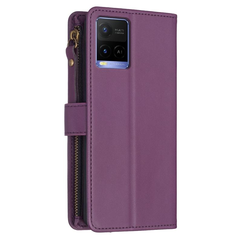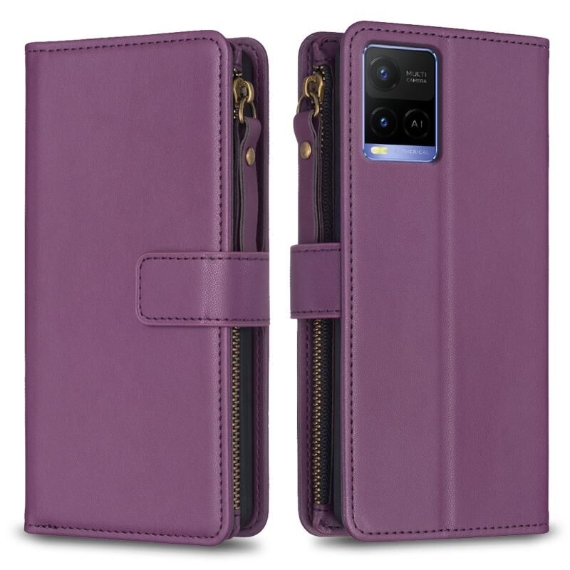 Για vivo Y21 / Y21s / Y33s Θήκη τηλεφώνου με δέρμα που αναδιπλώνεται, με φερμουάρ και 9 θήκες για κάρτες (Σκούρο μωβ)