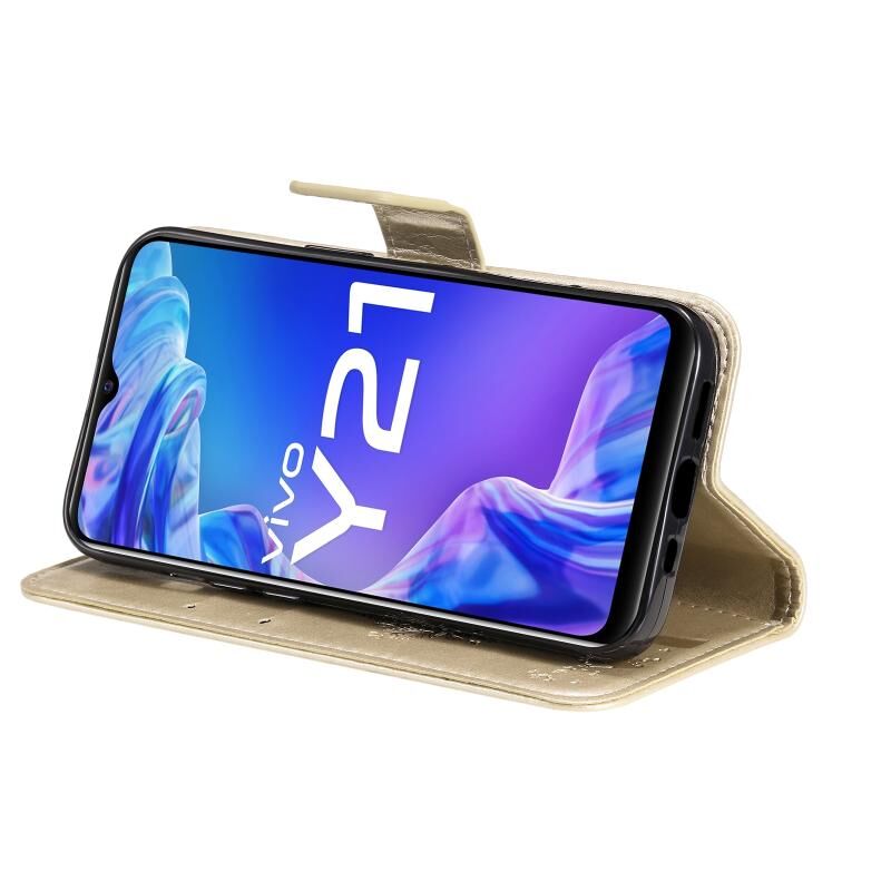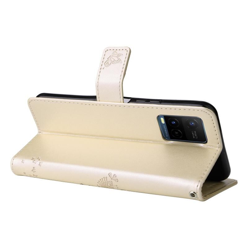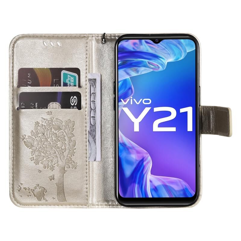Για το vivo Y21/Y21s/Y33s Tree & Cat Embossing Pattern Horizontal Flip PU Leather Case με θήκη για κάρτες & υποδοχές για κάρτες & πορτοφόλι & κορδόνι (χρυσό)