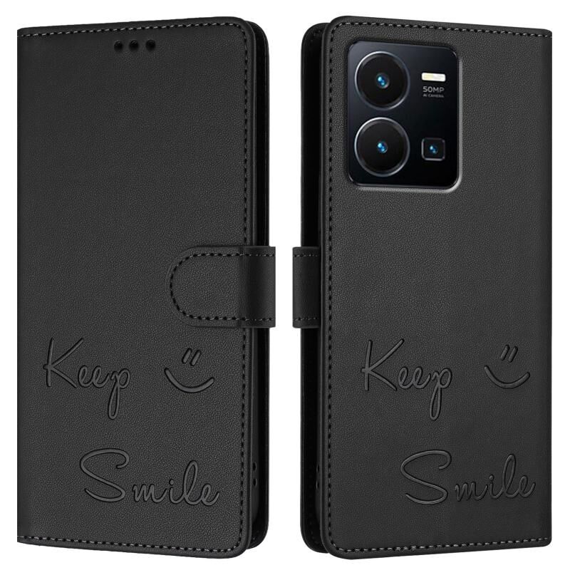 Για vivo Y22 4G Παγκόσμια χαμόγελο ανάγλυφο RFID δερμάτινη θήκη τηλεφώνου (Μαύρο)