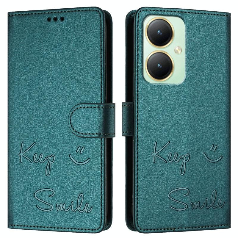 Για vivo Y27 4G 2023 Παγκόσμια χαμόγελο ανάγλυφο RFID δερμάτινη θήκη τηλεφώνου (Peacock Green)