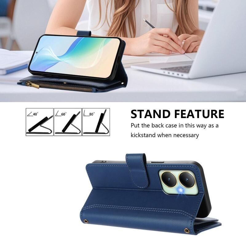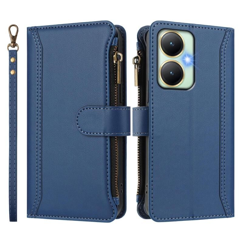 Για vivo Y27 4G 2023 Μαγνητικό Κλείσιμο 9 Θήκες Κάρτας Δερμάτινη Θήκη με Φερμουάρ και Λουρί Χεριού (Σκούρο μπλε)
