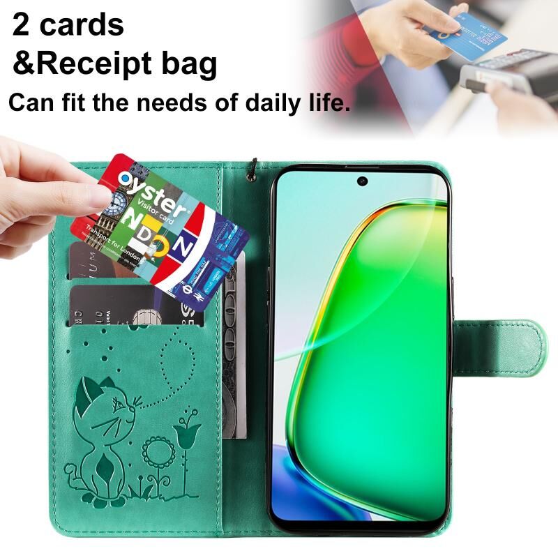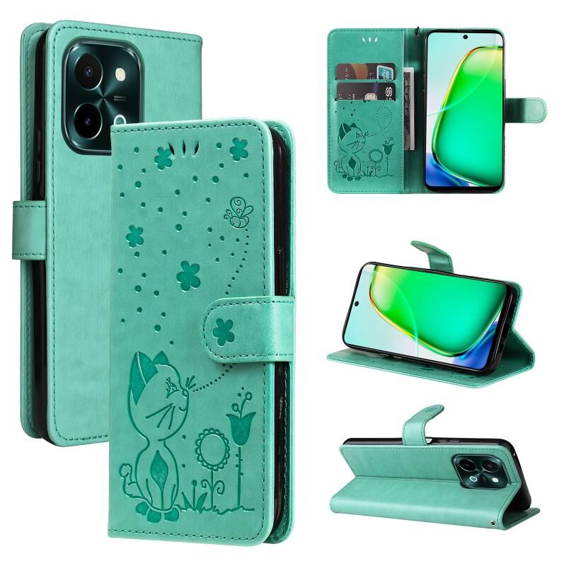 Θήκη τηλεφώνου για vivo Y28 4G, δερμάτινη, τύπου flip με ανάγλυφο σχέδιο γάτας και μέλισσας (Κόκκινη)