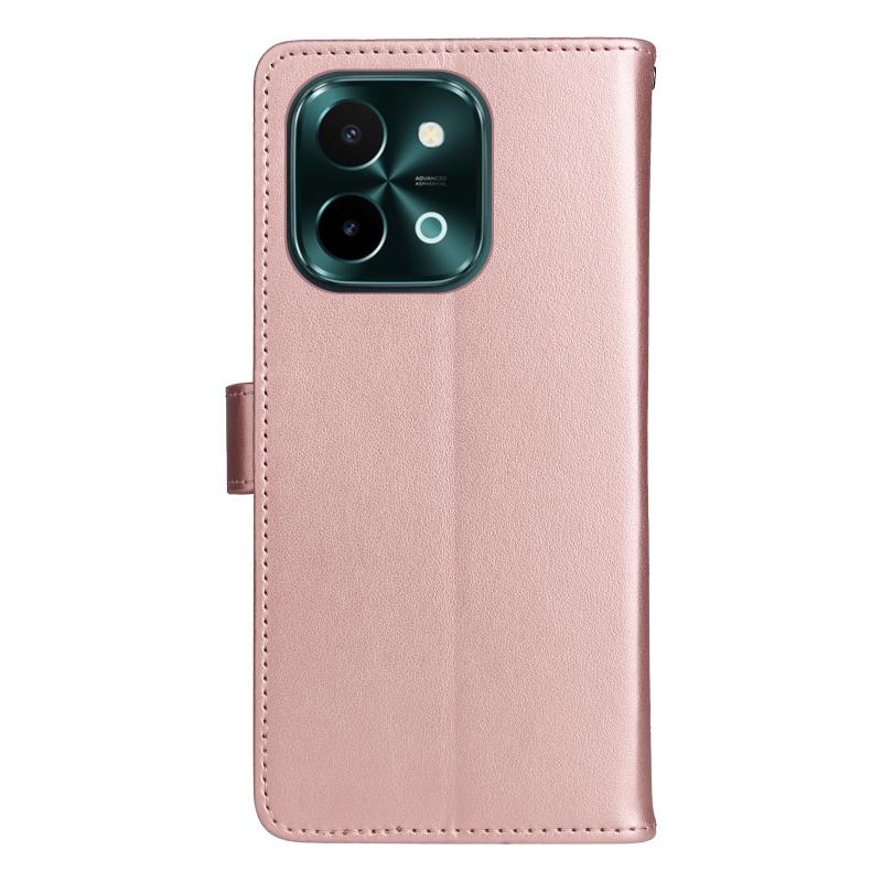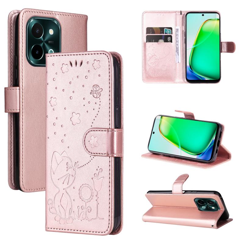 For vivo Y28 4G Cat and Bee Embossed Flip Leather Phone Case(Rose Gold)