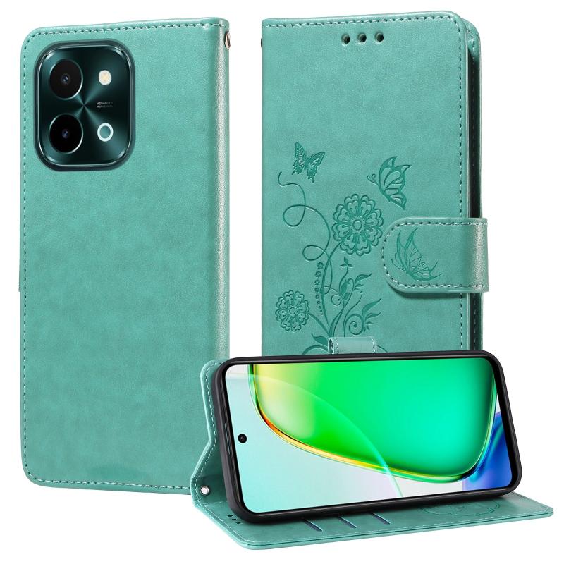 For vivo Y28 4G Embossed Butterfly Flowers Leather Phone Case(Green)