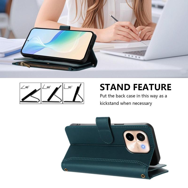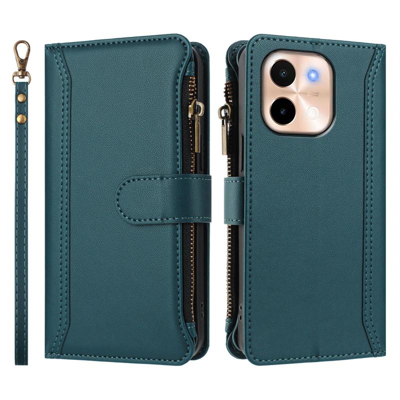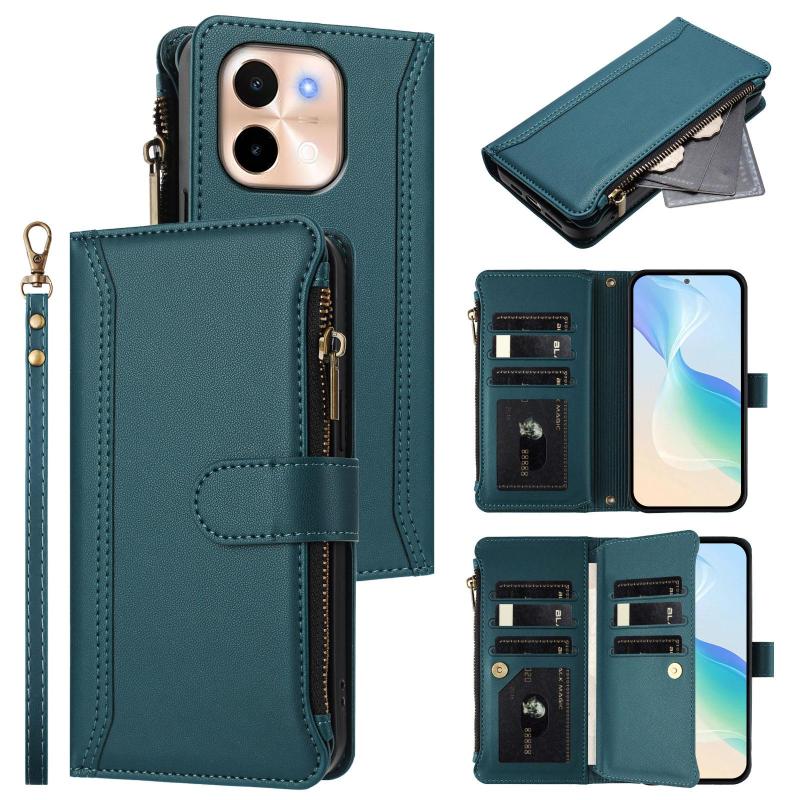 For vivo Y28 4G Global Magnetic Closure 9 Card Slots Zipper Leather Case with Hand Strap(Dark Green)