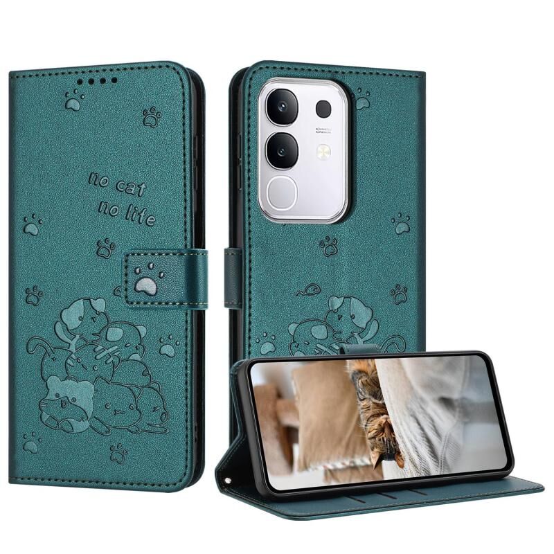 Θήκη δερμάτινη για vivo Y29 4G με ανάγλυφο γατάκι και κορδόνι (Μωβ)