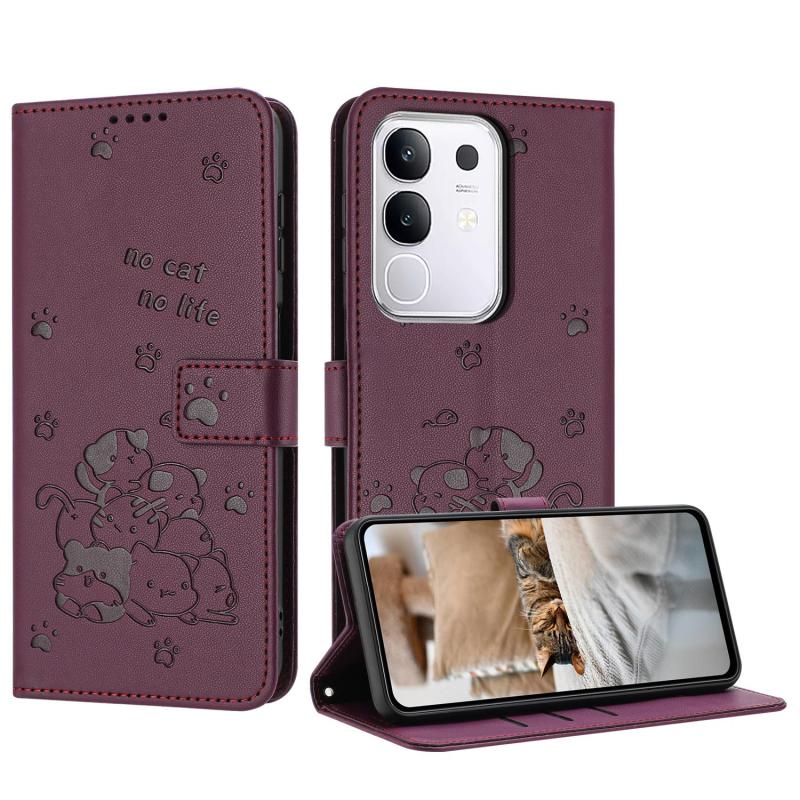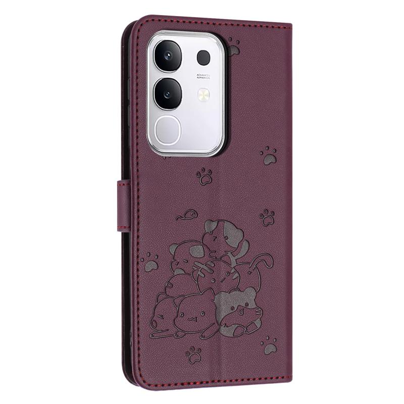 For vivo Y29 4G Embossed Kitten Phone Leather Case with Lanyard(Wine Red)