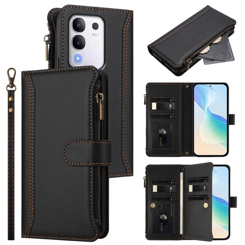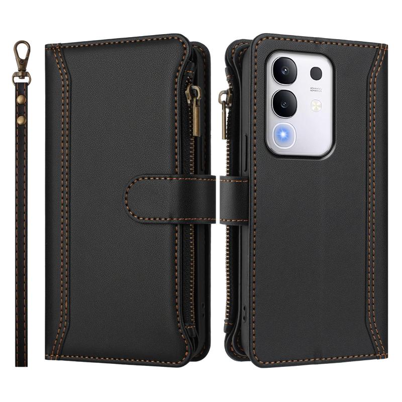 For vivo Y29 4G Global Magnetic Closure 9 Card Slots Zipper Leather Case with Hand Strap(Black)