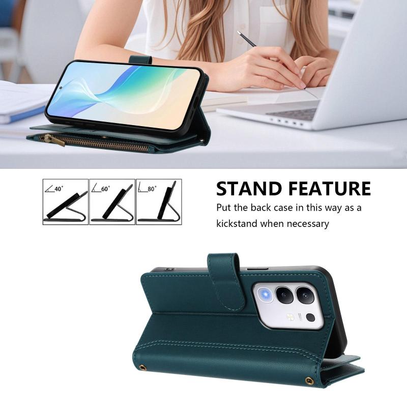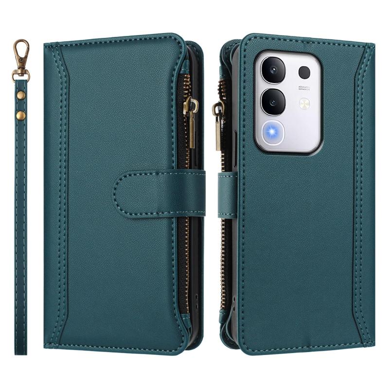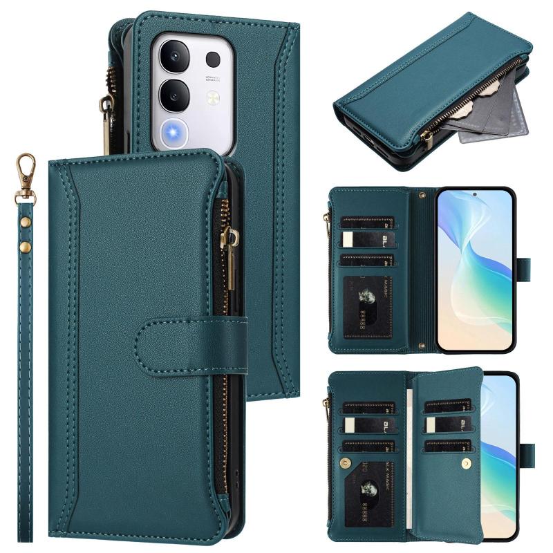 Για vivo Y29 4G Global Μαγνητικό Κλείσιμο 9 Θήκες Καρτών Δερμάτινη Θήκη με Φερμουάρ και Λουρί Χεριού (Σκούρο πράσινο)
