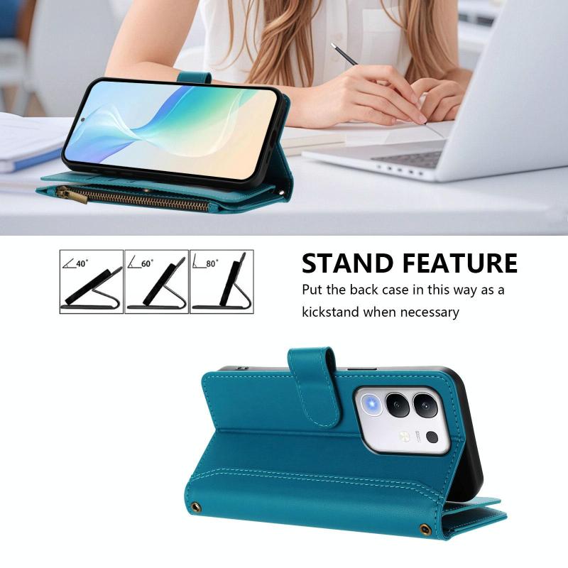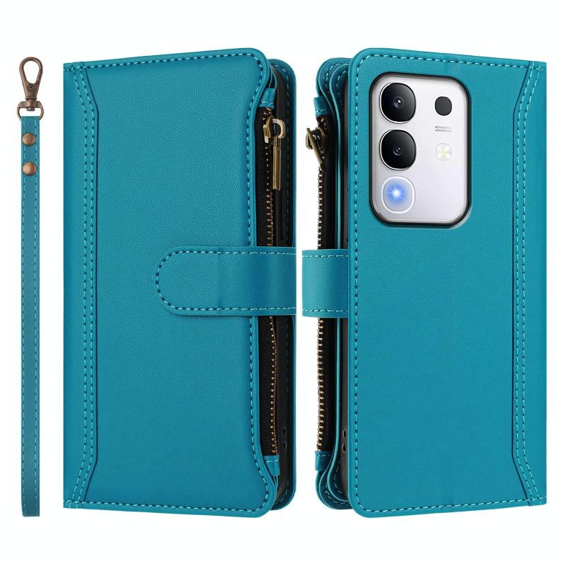 For vivo Y29 4G Global Magnetic Closure 9 Card Slots Zipper Leather Case with Hand Strap(Turquoise)