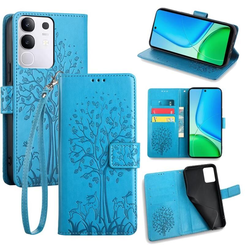 Θήκη τηλεφώνου από δέρμα με ανάγλυφο σχέδιο δέντρου & ελαφιού για vivo Y29 4G (Μπλε)