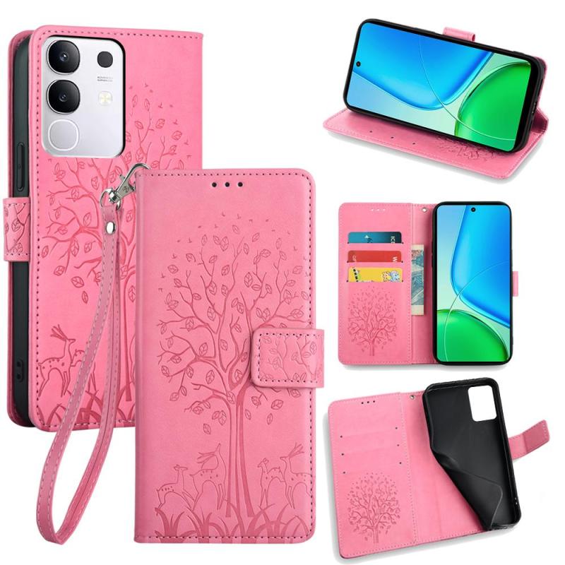 For vivo Y29 4G Global Tree & Deer Embossed Leather Phone Case(Pink)