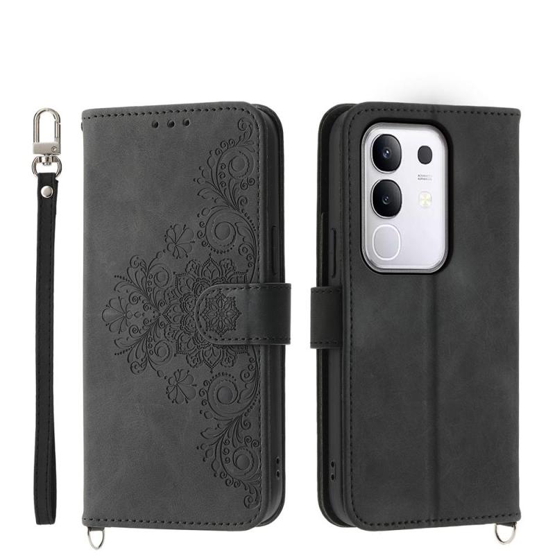 For vivo Y29 4G Skin Feel Flowers Embossed Wallet Leather Phone Case(Black)