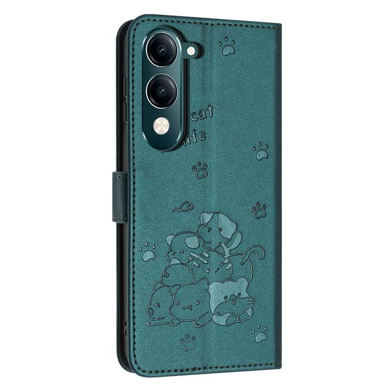 Θήκη τηλεφώνου από δέρμα με ανάγλυφο γατάκι για vivo Y29s 5G / Y04 4G με κορδόνι (Σκούρο πράσινο)