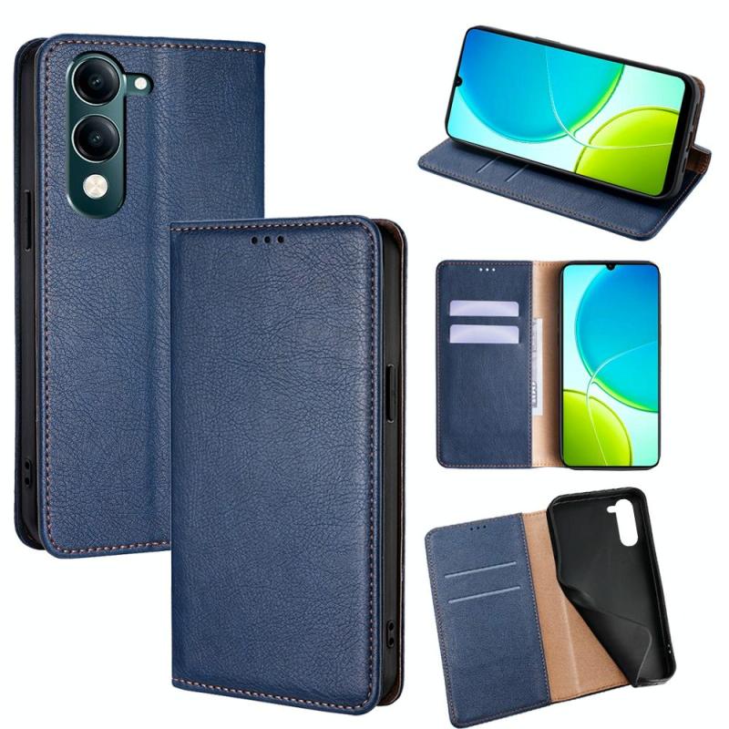 Θήκη τηλεφώνου από μαγνητικό δέρμα με γυαλιστερό λάδι και συμπαγές χρώμα για vivo Y29s 5G / Y04 4G (Μπλε)