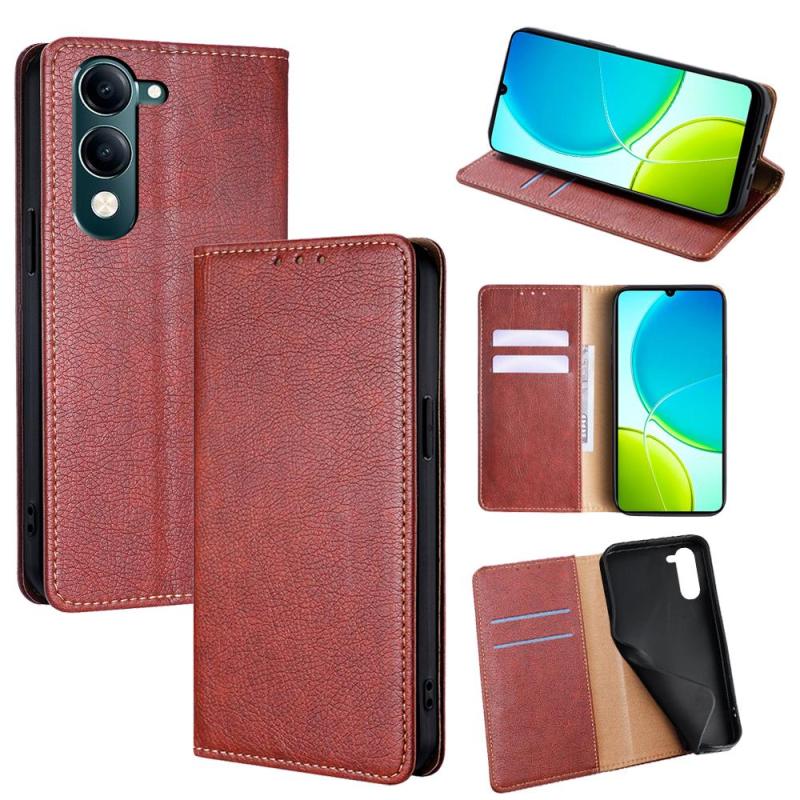 Θήκη τηλεφώνου από μαγνητικό δέρμα με γυαλιστερό λάδι και συμπαγές χρώμα για vivo Y29s 5G / Y04 4G (Καφέ)
