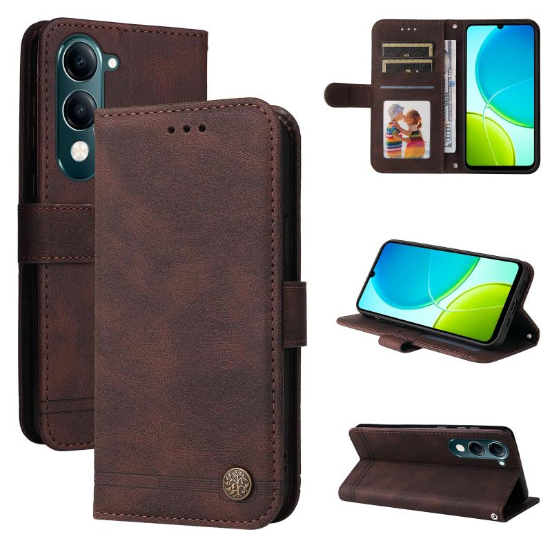 Θήκη τηλεφώνου για vivo Y29s 5G / Y04 4G με αίσθηση δέρματος, σχέδιο Δέντρο της Ζωής, μεταλλικά κουμπιά (Καφέ)