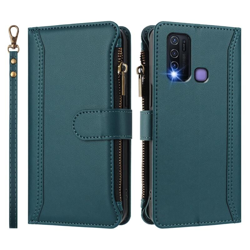 Για vivo Y30 4G Global Μαγνητικό Κλείσιμο 9 Θήκες Καρτών Δερμάτινη Θήκη με Φερμουάρ και Λουρί Χεριού (Σκούρο πράσινο)