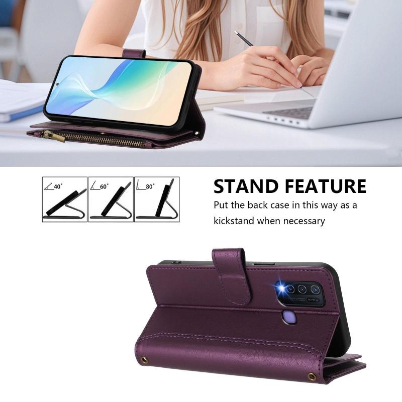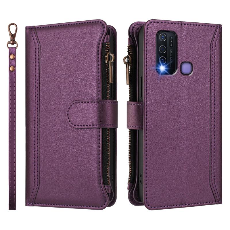 For vivo Y30 4G Global Magnetic Closure 9 Card Slots Zipper Leather Case with Hand Strap(Purple)