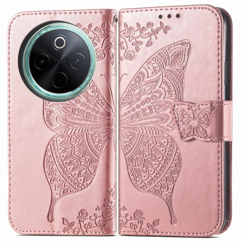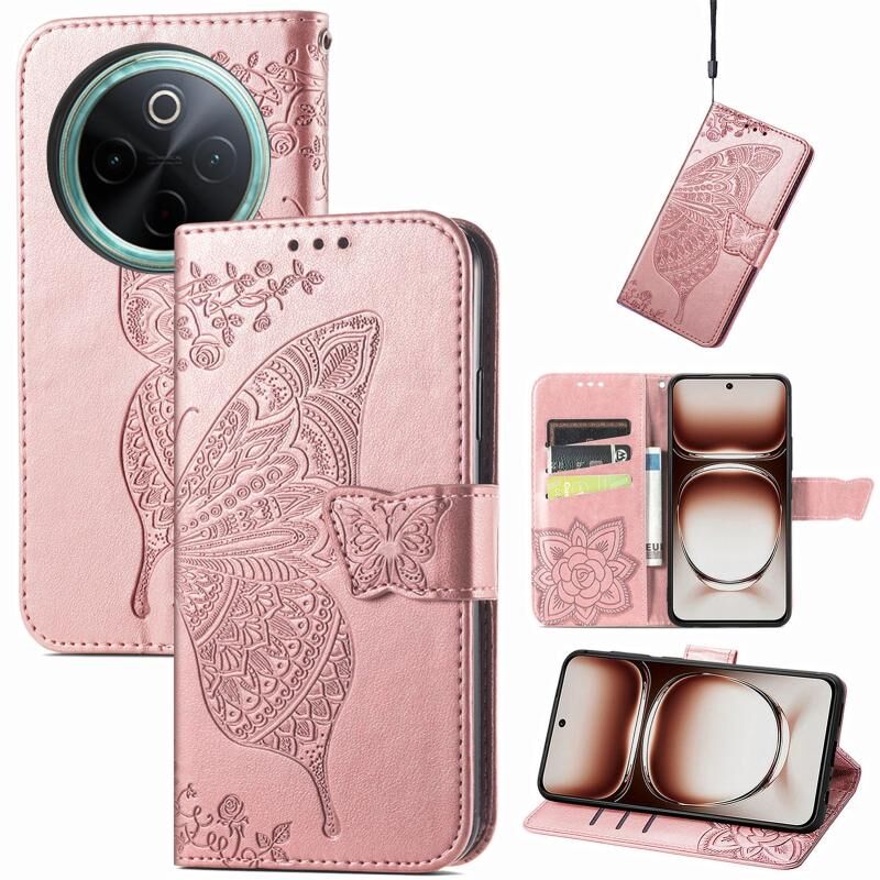 Θήκη δερμάτινη με ανάγλυφο σχέδιο πεταλούδας και λουλουδιών για vivo Y300 Pro (Ροζ Χρυσό)