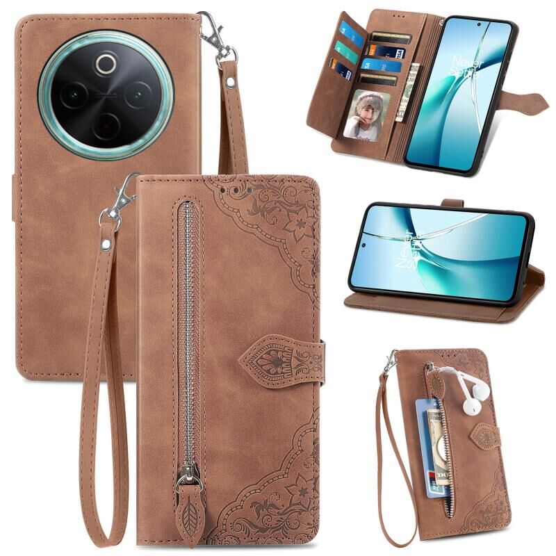 Θήκη τηλεφώνου δερμάτινη με ανάγλυφα λουλούδια και φερμουάρ για vivo Y300 Pro (Ροζ)