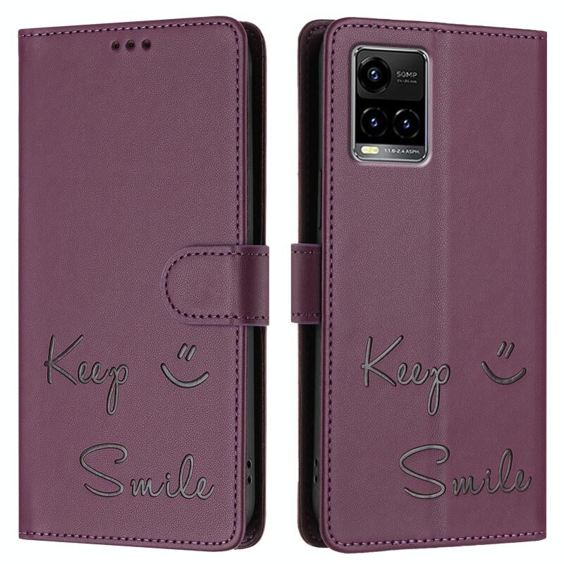 Για vivo Y33S 4G Παγκόσμια χαμόγελο ανάγλυφο RFID δερμάτινη θήκη τηλεφώνου (Violet)