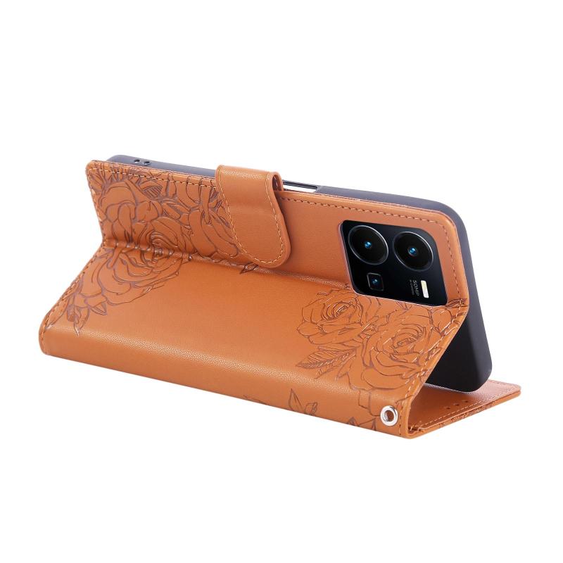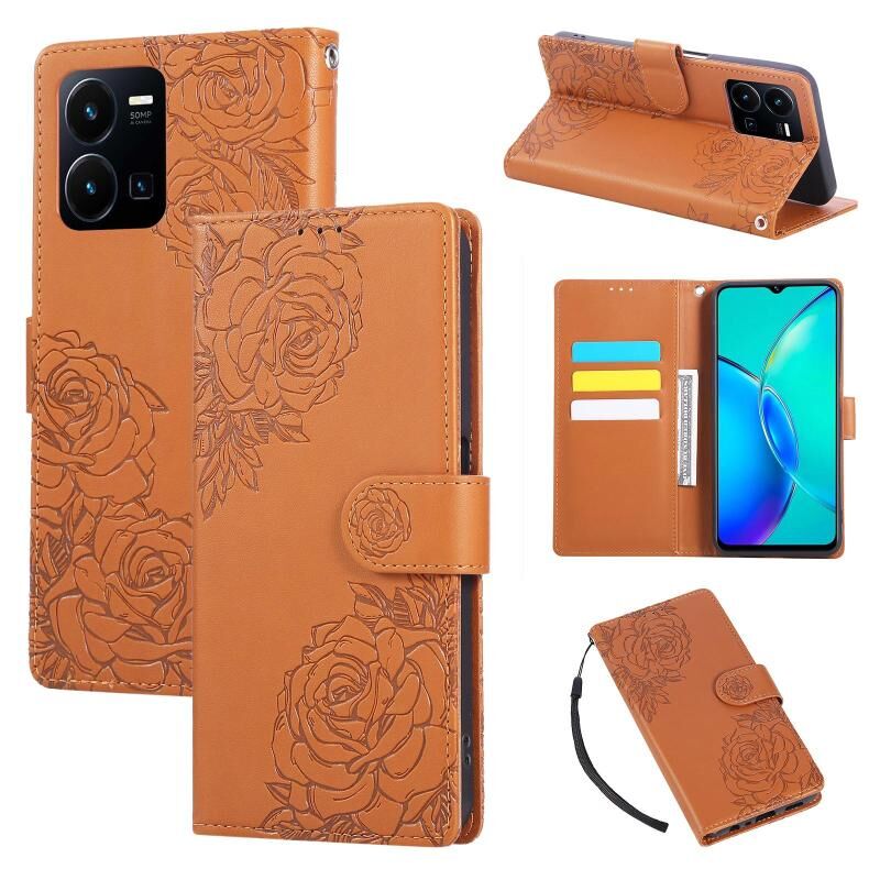 For vivo Y35 4G 2022 / Y22s Rose Flower Embossed 3-Card Slots Leather Phone Case(Brown)