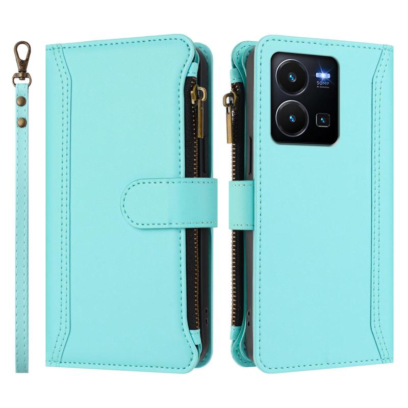 For vivo Y35 4G Global / Y77E 5G Magnetic Closure 9 Card Slots Zipper Leather Case with Hand Strap(Mint Green)
