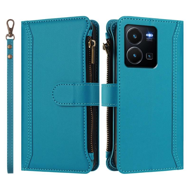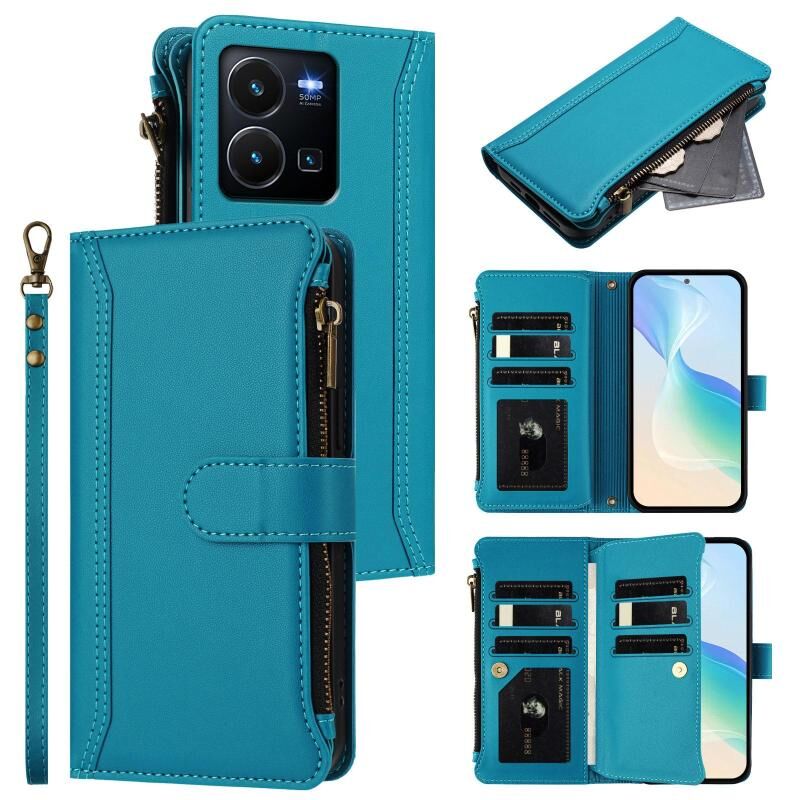For vivo Y35 4G Global / Y77E 5G Magnetic Closure 9 Card Slots Zipper Leather Case with Hand Strap(Turquoise)