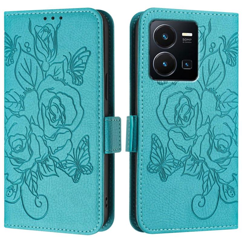 For vivo Y35 4G / Y22 4G / Y22s 4G Global Embossed Rose RFID Anti-theft Leather Phone Case(Light Blue)