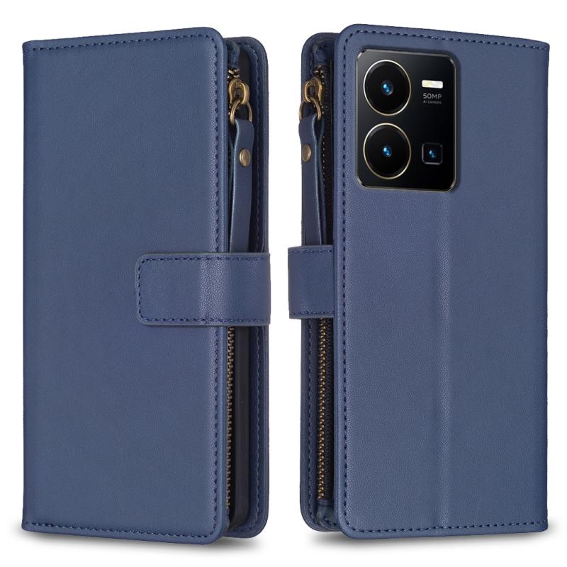 Για vivo Y35 4G / Y22s Θήκη τηλεφώνου με δέρμα τύπου flip με φερμουάρ και 9 θέσεις για κάρτες (Μπλε)