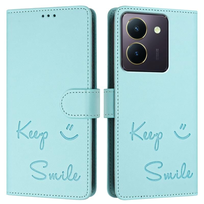 Για vivo Y36 4G Παγκόσμια χαμόγελο ανάγλυφο RFID δερμάτινη θήκη τηλεφώνου (πράσινο μέντα)