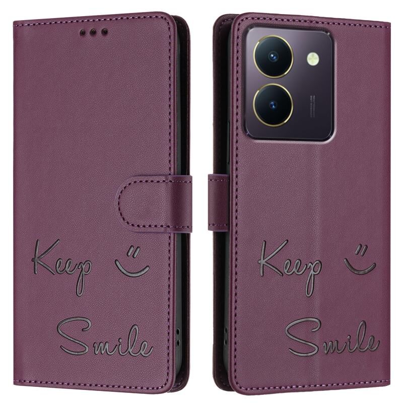 Για vivo Y36 4G Παγκόσμια χαμόγελο ανάγλυφο RFID δερμάτινη θήκη τηλεφώνου (Violet)