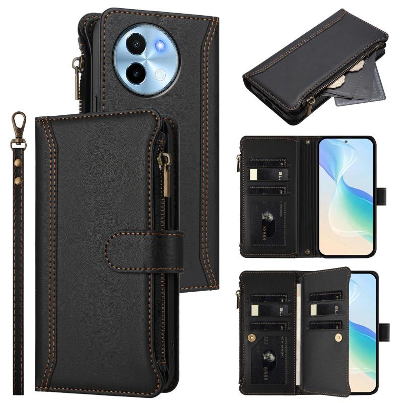 For vivo Y38 5G Global / T3X 5G Global Magnetic Closure 9 Card Slots Zipper Leather Case with Hand Strap(Black)