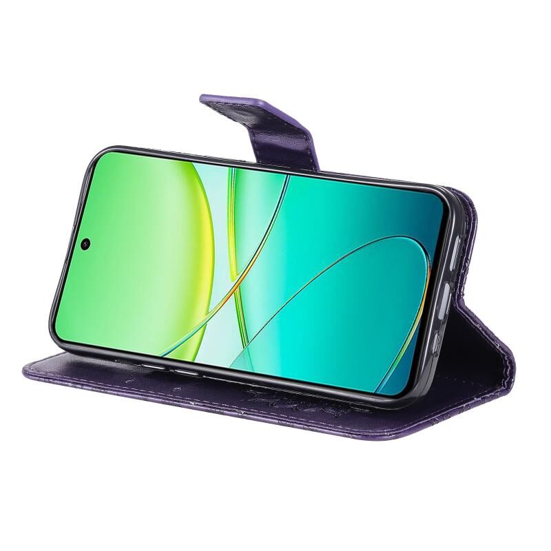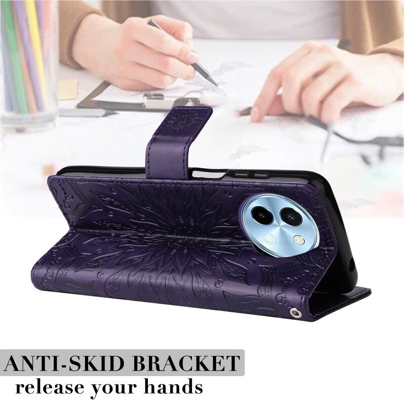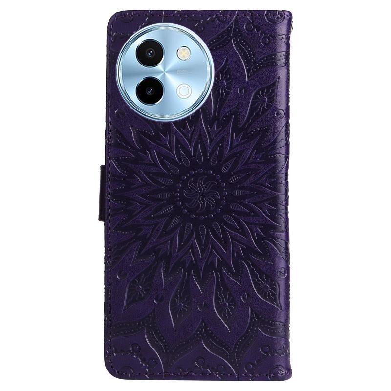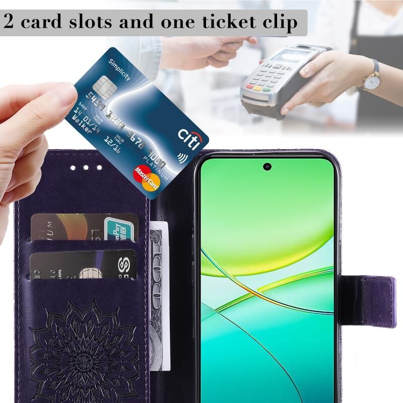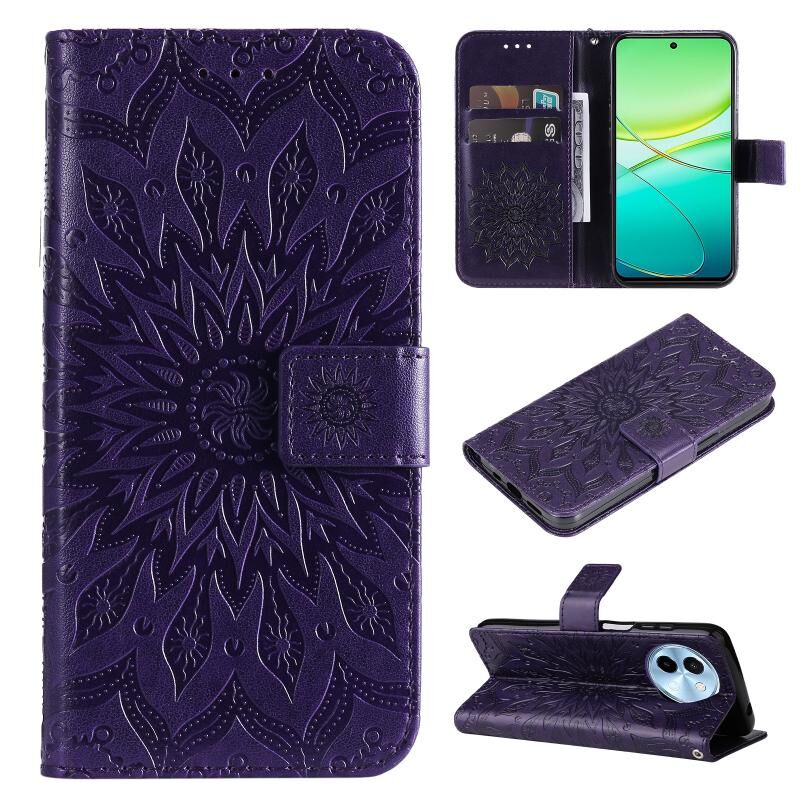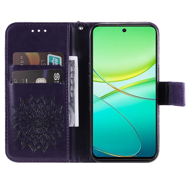 Για vivo Y38 / Y200i / T3x Παγκόσμια ανάγλυφο ηλιοτρόπιο μοτίβο Flip υπόθεση τηλεφώνου δέρμα (Μωβ)