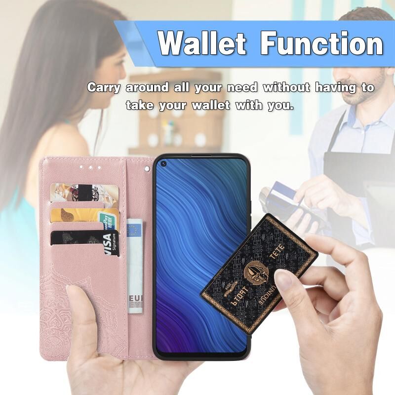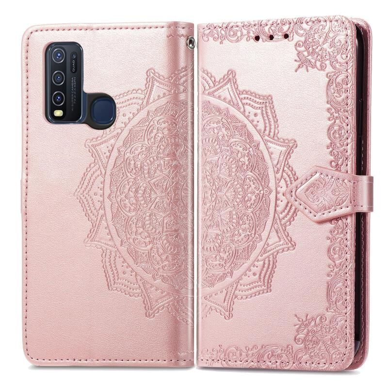 Θήκη για vivo Y50 Mandala Flower ανάγλυφη οριζόντια δερμάτινη με βάση & τρεις θήκες καρτών & πορτοφόλι & κορδόνι (Μαύρο)