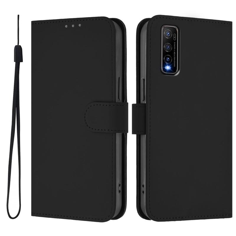 For vivo Y70S Skin Feel Solid Color Leather Phone Case with Lanyard(Black)