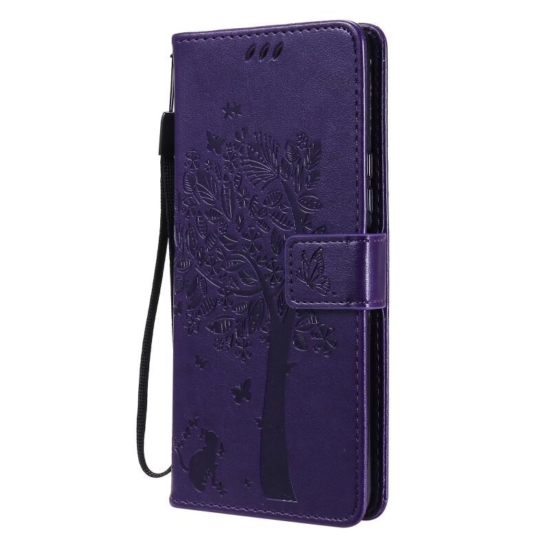Θήκη για vivo Y72 5G / iQOO Z3 με ανάγλυφο σχέδιο Δέντρου & Γάτας, οριζόντια, από δερματίνη PU με βάση στήριξης & θήκες για κάρτες & πορτοφόλι & κορδόνι (Μωβ)