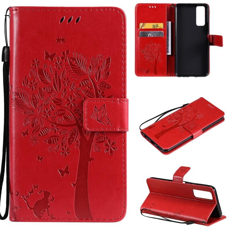 Θήκη για vivo Y72 5G / iQOO Z3 με ανάγλυφο σχέδιο Δέντρου & Γάτας, οριζόντια, από δερματίνη PU με βάση στήριξης & θήκες για κάρτες & πορτοφόλι & κορδόνι (Πράσινο)