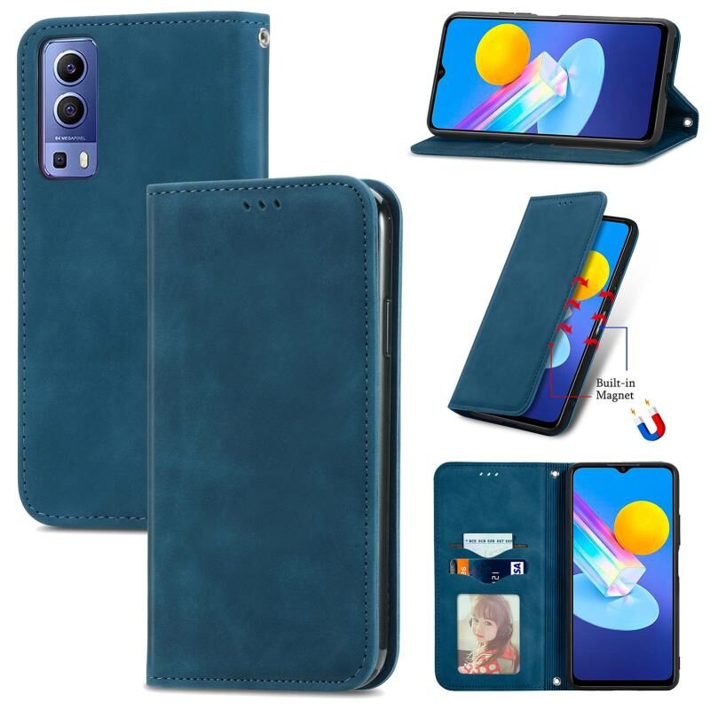 Για το vivo Y72 5G Retro Skin Feel Μαγνητική οριζόντια Flip δερμάτινη θήκη με θήκη & υποδοχές καρτών & πορτοφόλι & πλαίσιο φωτογραφιών (μπλε)