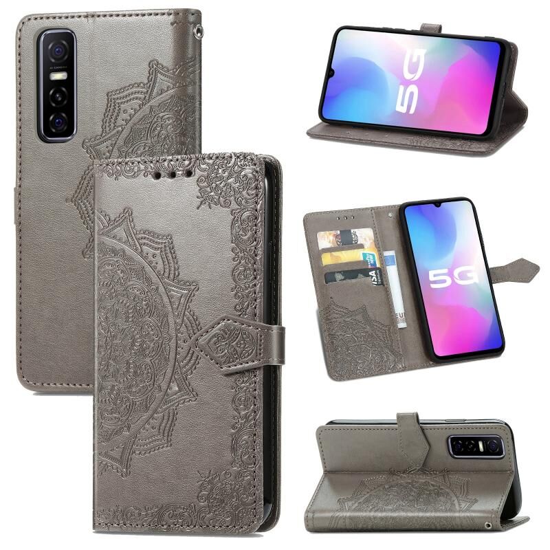 Θήκη δέρματος οριζόντιας αναδίπλωσης για vivo Y73S 5G με ανάγλυφο σχέδιο Mandala Flower, με βάση στήριξης & τρεις θήκες για κάρτες & πορτοφόλι & κορδόνι (Γκρι)
