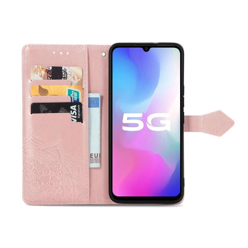 Θήκη δέρματος οριζόντιας αναδίπλωσης για vivo Y73S 5G με ανάγλυφο σχέδιο Mandala Flower, με βάση στήριξης & τρεις θήκες για κάρτες & πορτοφόλι & κορδόνι (Ροζ χρυσός)