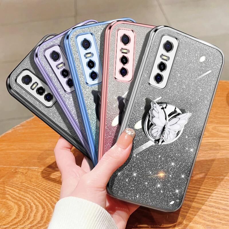Για το vivo Y73s Επιμεταλλωμένο διαβάθμιση Glitter πεταλούδα κάτοχος TPU τηλέφωνο υπόθεση (μαύρο)