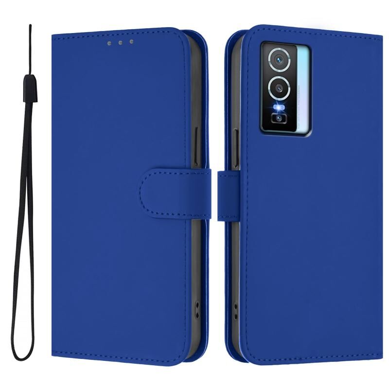 Θήκη τηλεφώνου από δέρμα με συμπαγή χρώματα και αίσθηση δέρματος για vivo Y76 5G με κορδόνι (Σκούρο μπλε)