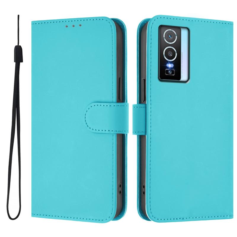 Θήκη τηλεφώνου από δέρμα με συμπαγή χρώματα και αίσθηση δέρματος για vivo Y76 5G με κορδόνι (Γαλάζια Λίμνης)