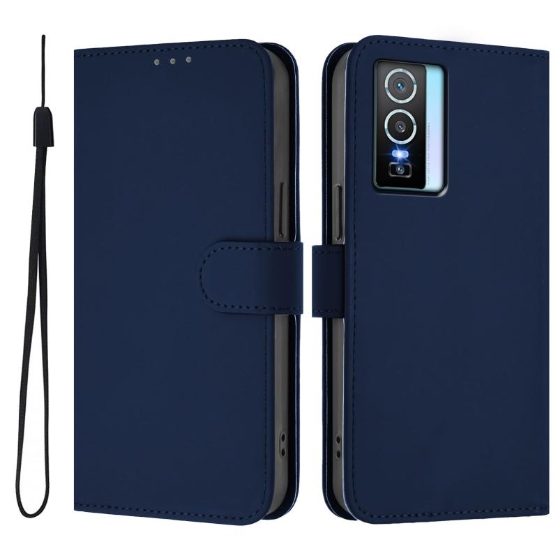 For vivo Y76 5G Skin Feel Solid Color Leather Phone Case with Lanyard(Navy Blue)
