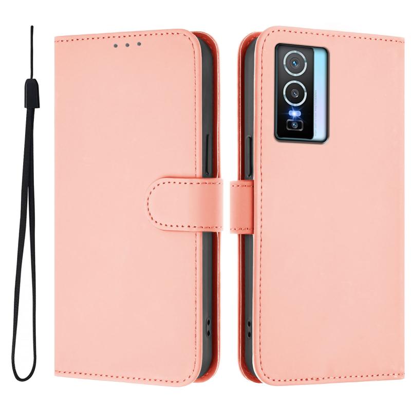 For vivo Y76 5G Skin Feel Solid Color Leather Phone Case with Lanyard(Pink)
