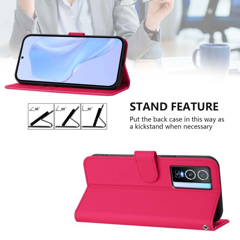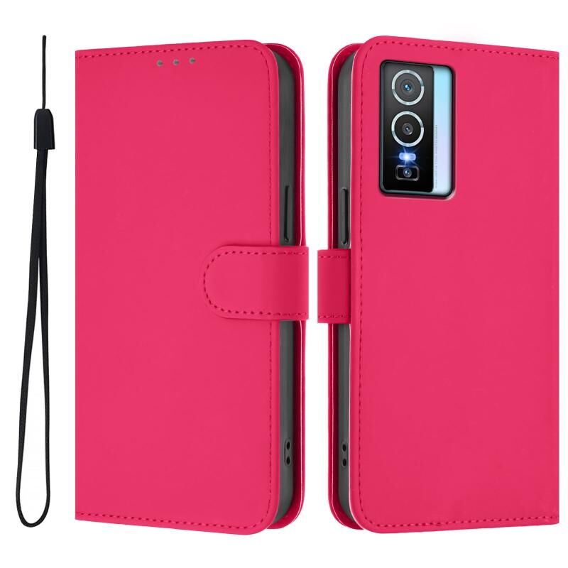 Θήκη τηλεφώνου από δέρμα με συμπαγή χρώματα και αίσθηση δέρματος για vivo Y76 5G με κορδόνι (Ροζέ κόκκινο)