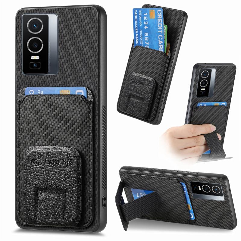 For vivo Y76 Carbon Fiber Card Bag Fold Stand Phone Case(Black)